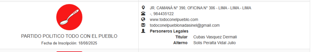 De acuerdo con el Oficio N.° 004282-2025-DNROP/JNE, emitido el 18 de agosto, Todo con el Pueblo quedó registrado con sus personeros legales, Dermali Cubas Vásquez y Vidal Julio Solís Peralta, además de 77 comités provinciales, de los cuales 70 cumplieron los requisitos en 20 departamentos.