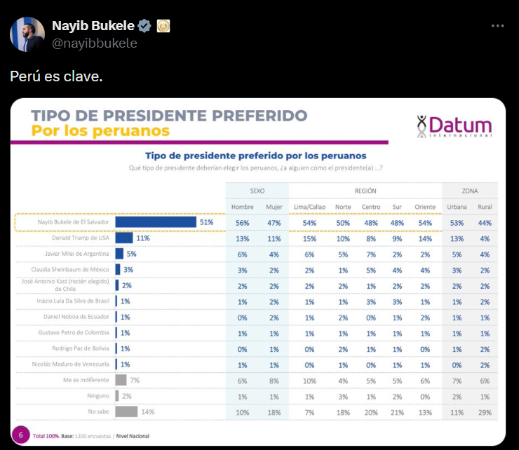 Según el estudio, el 51 % de los consultados desea un presidente con un perfil similar al del mandatario salvadoreño, hecho que no fue pasado desapercibido por Bukele.