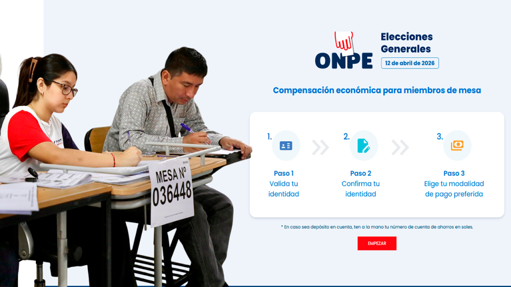 Para ello, la Oficina Nacional de Procesos Electorales (ONPE) habilitó una plataforma virtual donde los beneficiarios deberán registrar sus datos personales y elegir la modalidad de pago. Este proceso estará disponible hasta las 6:00 p.m. del 17 de abril.
