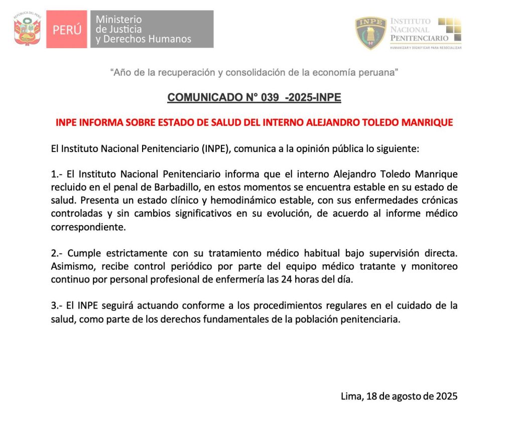 Horas después de la audiencia, el Instituto Nacional Penitenciario (INPE) informó que Toledo se encuentra clínicamente estable y que sus enfermedades crónicas están controladas, sin cambios significativos en su evolución.