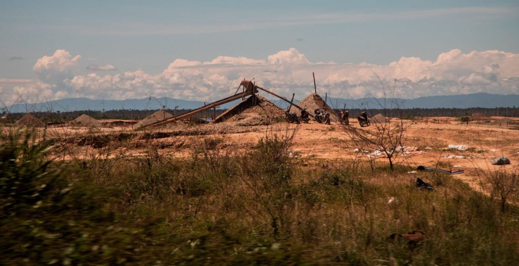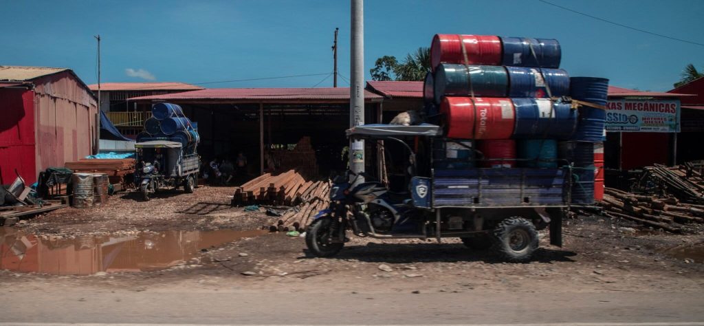 En ambos lados de la carretera Interoceánica Sur —vía que va desde el océano Pacifico en Perú hasta el océano Atlántico en Brasil—, entre los kilómetros 98 y 117, aproximadamente, incontables dragas, tracas y retroexcavadoras funcionan sin tregua. La ruta también está copada de edificios en construcción, hoteles, grifos, establecimientos con decenas de cilindros azules en los que se transporta combustible, centros de venta de motores, talleres, agentes multibancos, restaurantes, bares. Todo un ecosistema que rodea a la minería ilegal.