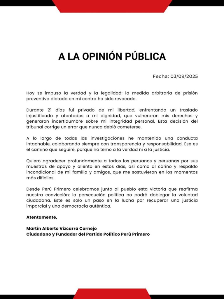 Tras su excarcelación, Vizcarra difundió un comunicado en el que aseguró que su detención fue arbitraria y que su libertad es una victoria frente a la persecución política: