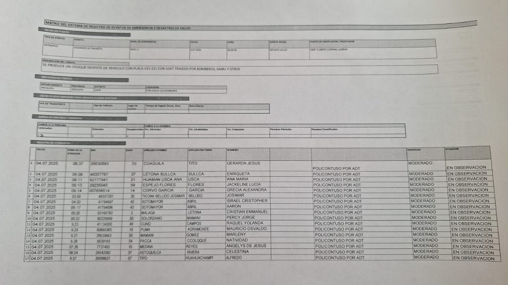 Lista de heridos de volcadura de cúster en José Luis Bustamante y Rivero