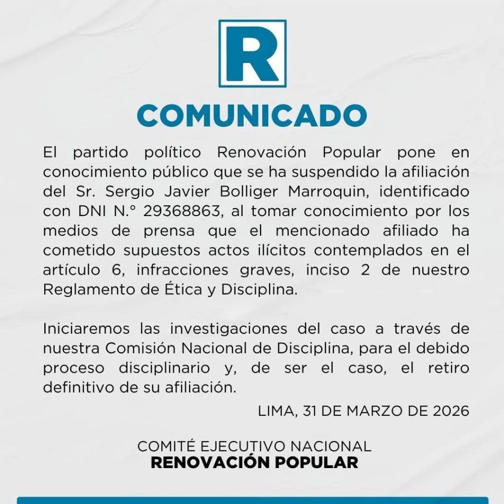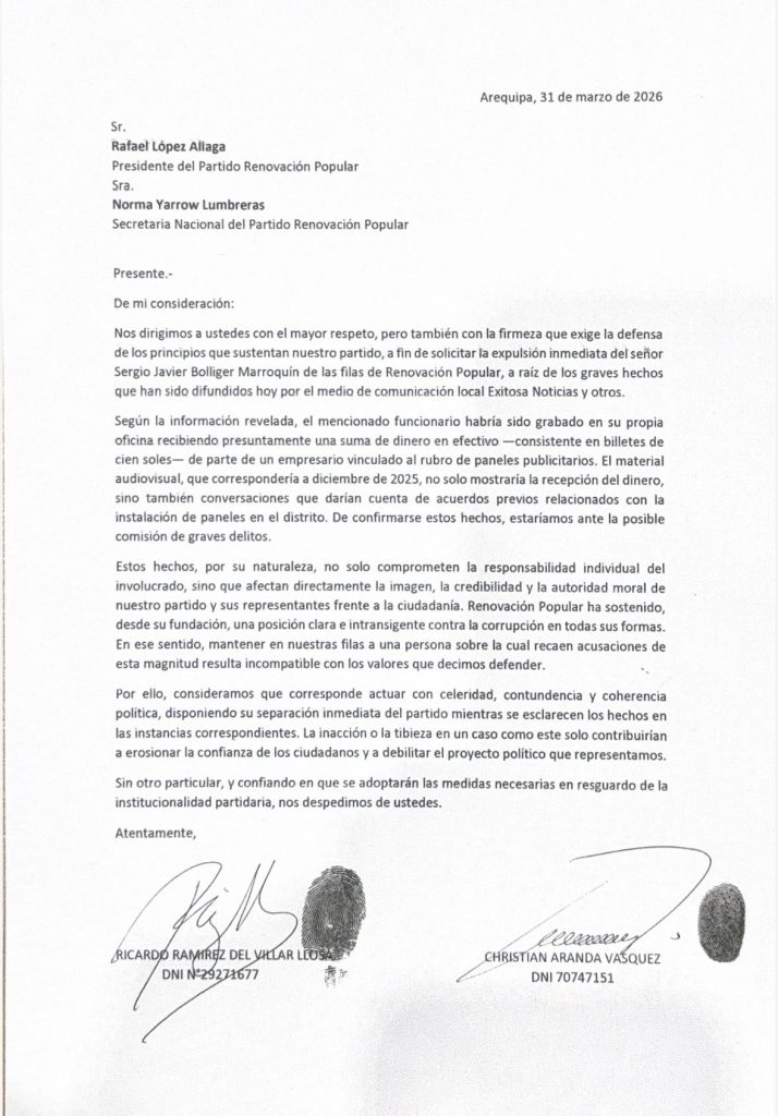 Por su parte, los candidatos al Congreso bicameral, Christian Aranda y Ricardo Ramírez del Villar, también emitieron un comunicado en el que solicitaron la expulsión del burgomaestre, al considerar que este hecho daña la imagen del partido a pocos días de las elecciones.