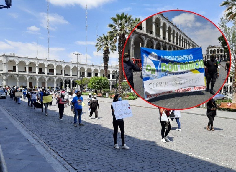 En la marcha participaron microempresarios que pertenecen a la Cámara de Centros Comerciales de Arequipa que se verán afectados por las nuevas restricciones que les impedirán expender sus productos.