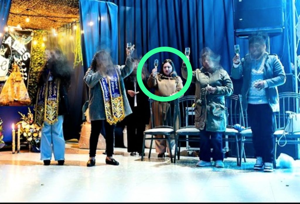 La cuenta «Caporales Huáscar 1982» difundió una imágen de Mamani Juárez participando de una misa de albas el pasado 7 de febrero en honor a la santa virgen. En la foto se visualiza a la Gerente Regional de EsSalud, sosteniendo una copa en un acto de brindis, en compañía de almenos 5 miembros de la Asociación Cultural Folclórica.