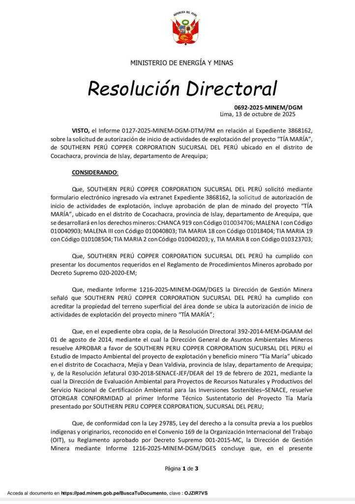 El Ministerio de Energía y Minas (Minem) oficializó la autorización para que Southern Perú Copper Corporation inicie las actividades de explotación del proyecto Tía María, ubicado en el distrito de Cocachacra, provincia de Islay, región Arequipa.