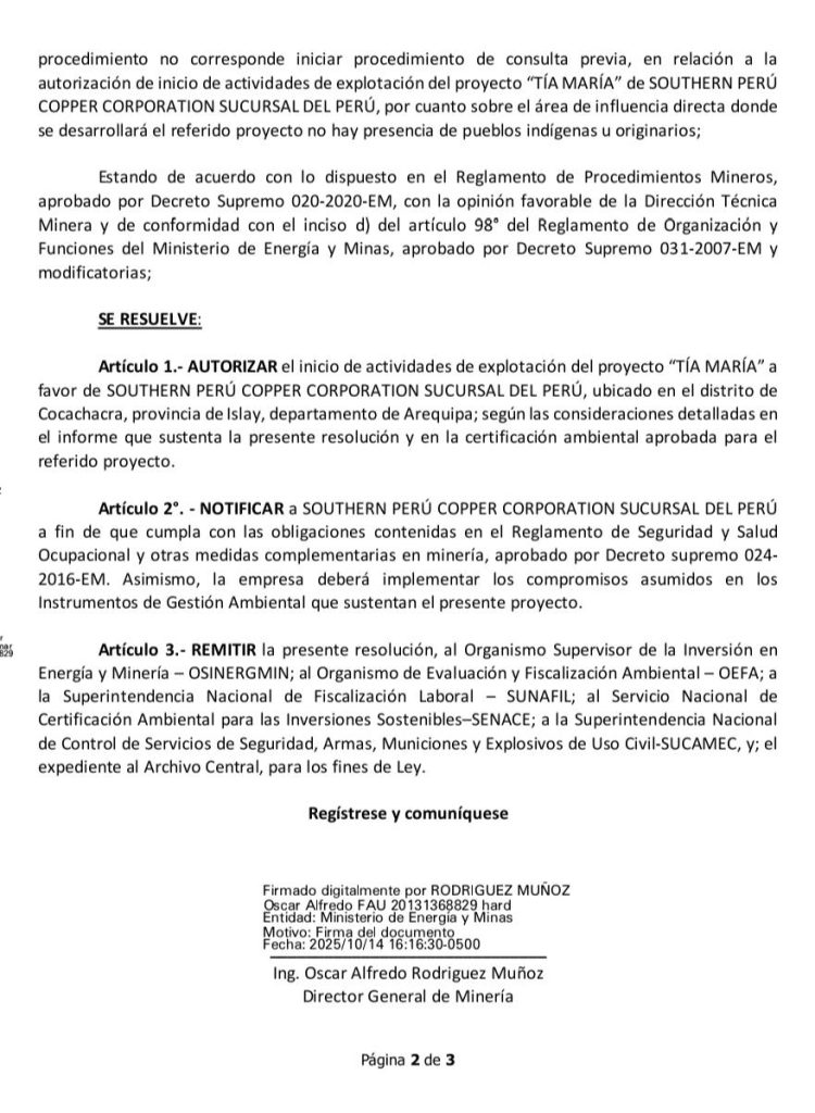 Con esta decisión, el Gobierno habilita oficialmente el arranque operativo de Tía María, un proyecto que por años dividió a la población de Islay y generó múltiples enfrentamientos entre los agricultores y autoridades.