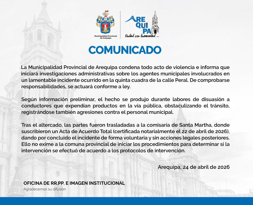 Cabe precisar que los hechos ocurrieron a plena luz del día, el miércoles 22 de abril, durante labores de disuasión a comerciantes que expendían productos en la vía pública y obstaculizaban el tránsito. Según un comunicado de la Municipalidad Provincial de Arequipa, en dicha situación también se registraron agresiones contra el personal municipal.