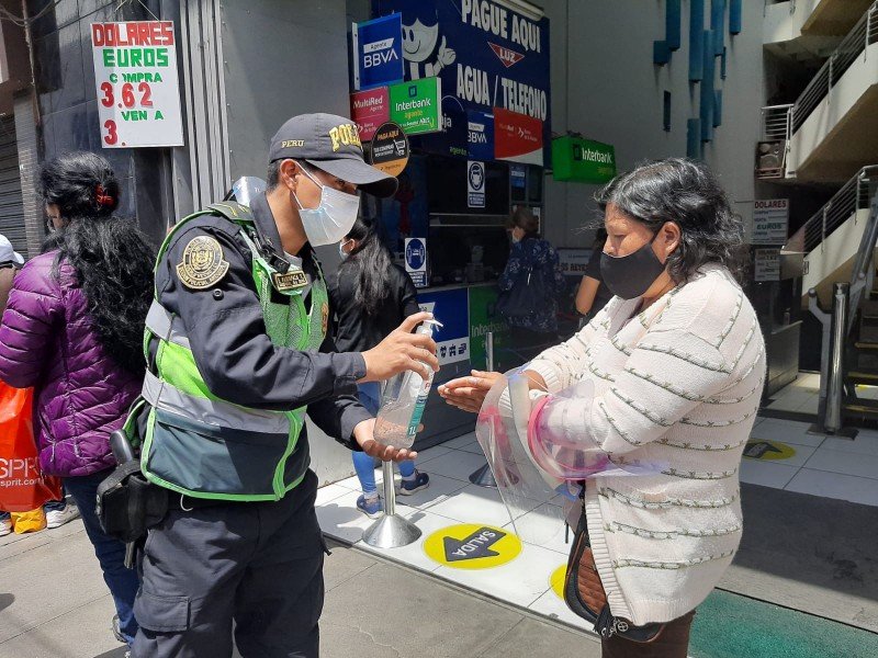 Efectivos de la Policía Nacional del Perú (PNP) entregaron mascarillas y desinfectaron con alcohol en gel a los usuarios del Banco de la Nación que formaban largas colas en los exteriores de la entidad.