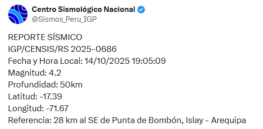 Un sismo de magnitud 4.2 se registró la noche de este lunes 14 de octubre de 2025 en la región Arequipa, según información oficial del Instituto Geofísico del Perú (IGP).