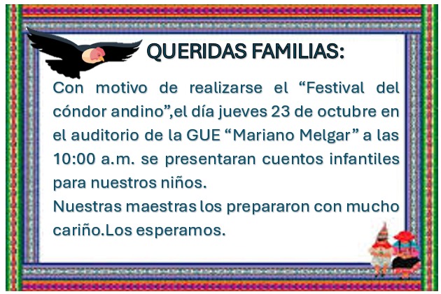 • 23 de octubre: concurso de melodramas con docentes de la UGEL Sur en la G.U.E. Mariano Melgar.