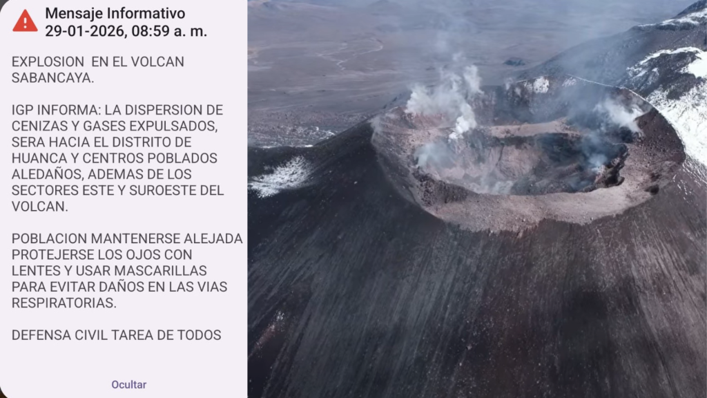 El Instituto Geofísico del Perú (IGP) informó que la explosión moderada registrada el 29 de enero a las 7:18 horas en el volcán Sabancaya (Caylloma) corresponde al comportamiento esperado de su proceso eruptivo actual, en el marco del nivel de alerta naranja. Este evento generó una columna de cenizas que alcanzó aproximadamente los 3400 metros de altura, con dispersión hacia el distrito de Huanca y centros poblados aledaños, de acuerdo con la dirección del viento, sin que ello represente una variación significativa en la actividad del volcán.